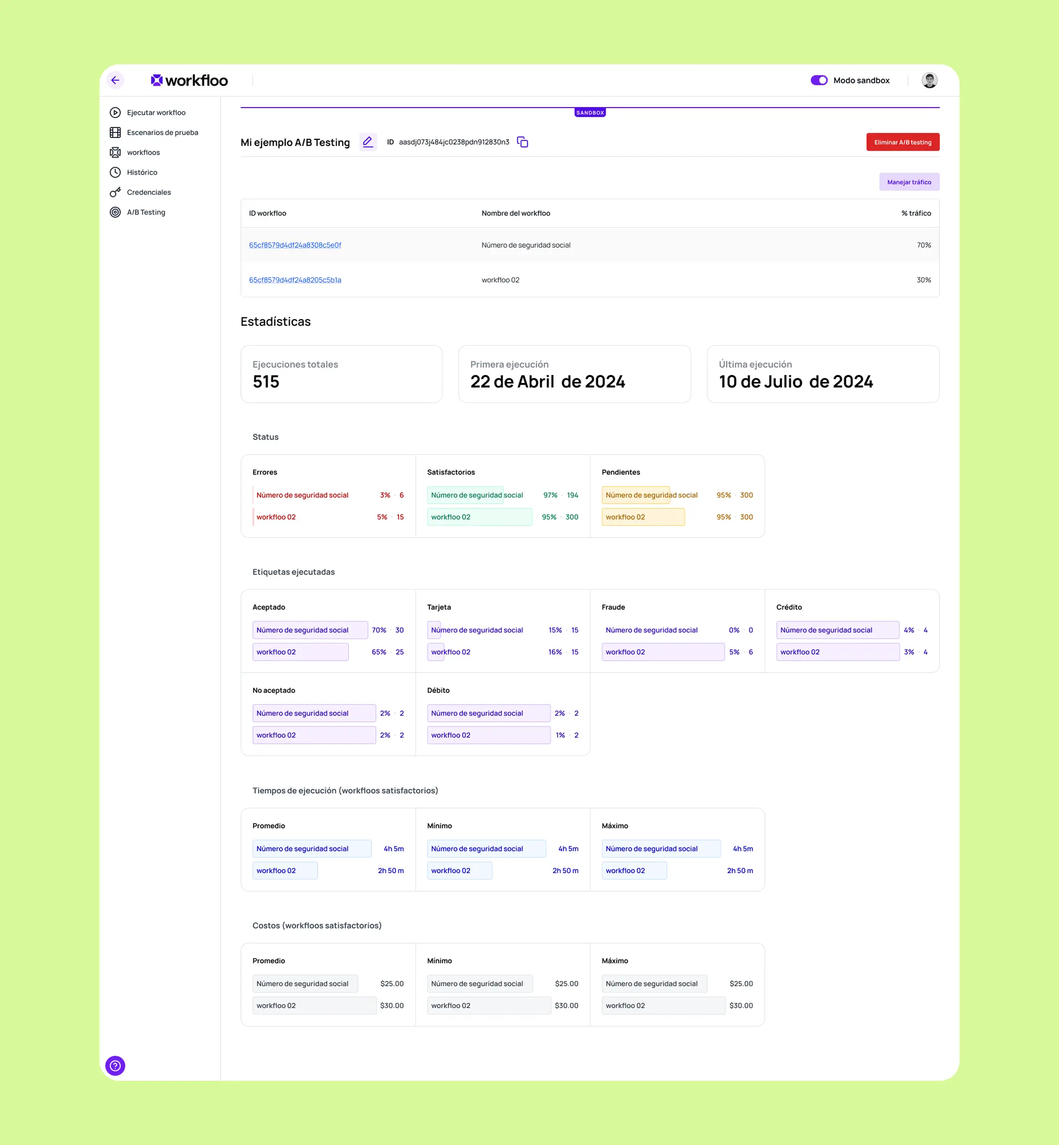 Workfloo’s A/B testing lets users compare two workflows across multiple executions, controlling how often each one runs through configurable traffic percentages. The dashboard then displays the results of each workflow, helping teams evaluate outcomes, performance, and execution behavior over time.