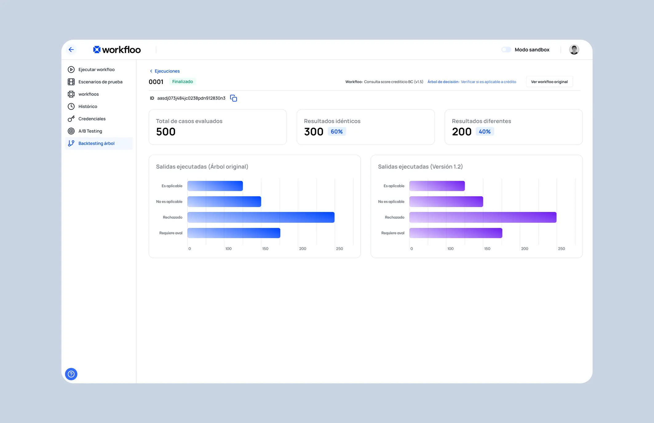 Workfloo’s backtesting lets users validate decision tree changes against historical data, comparing updated outputs with the original workflow behavior. This helps teams measure the impact of new rules before applying them to real credit operations.