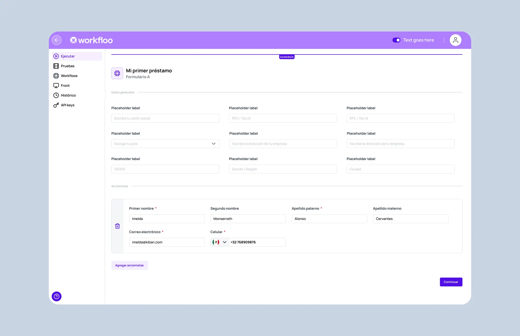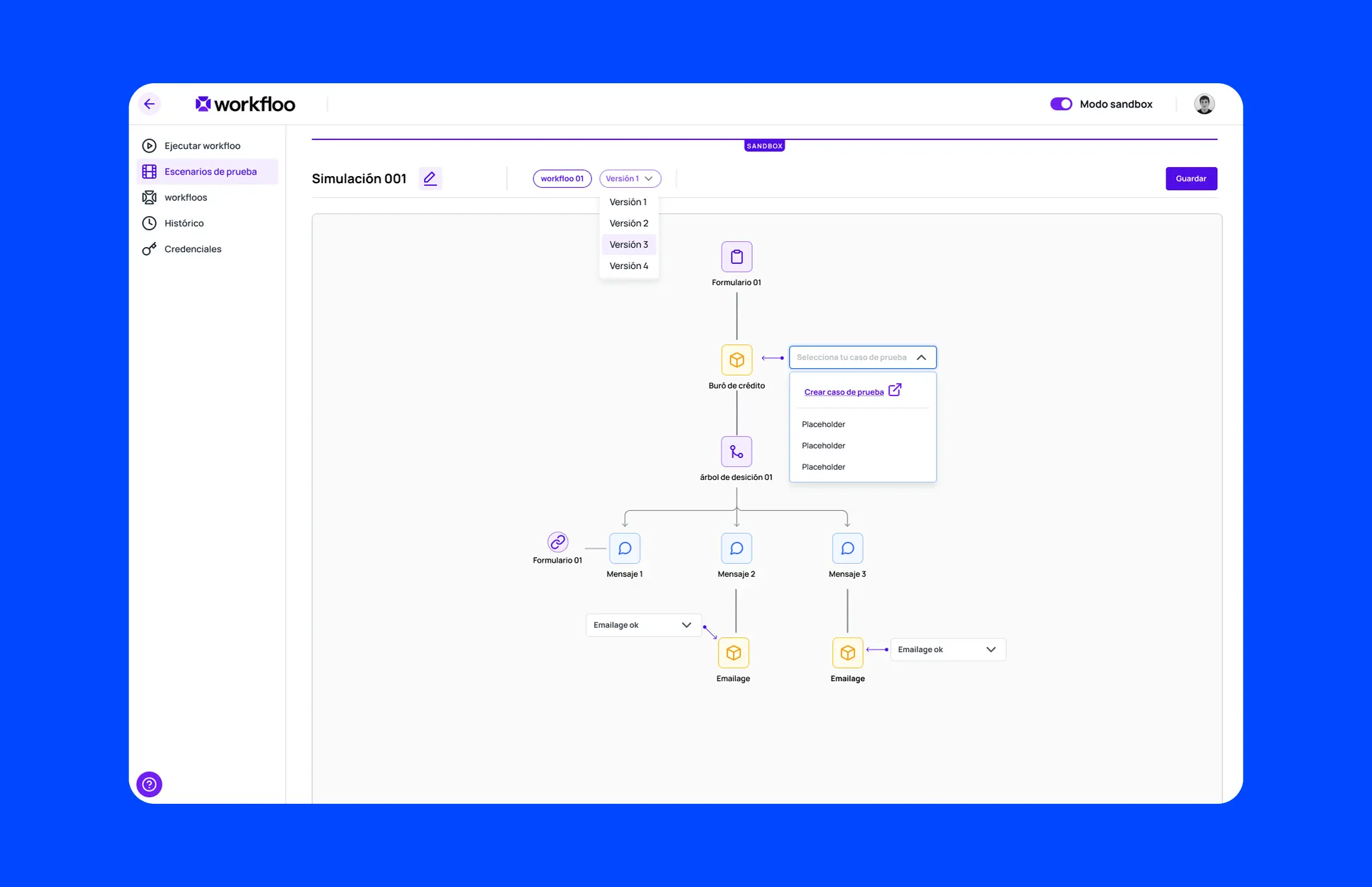Workfloo’s test cases let users safely validate workflows in sandbox mode using predefined scenarios tied to specific connectors and responses. This makes it possible to simulate static Buró de Crédito, Círculo de Crédito, and other integration outputs before running workflows in real operational environments.